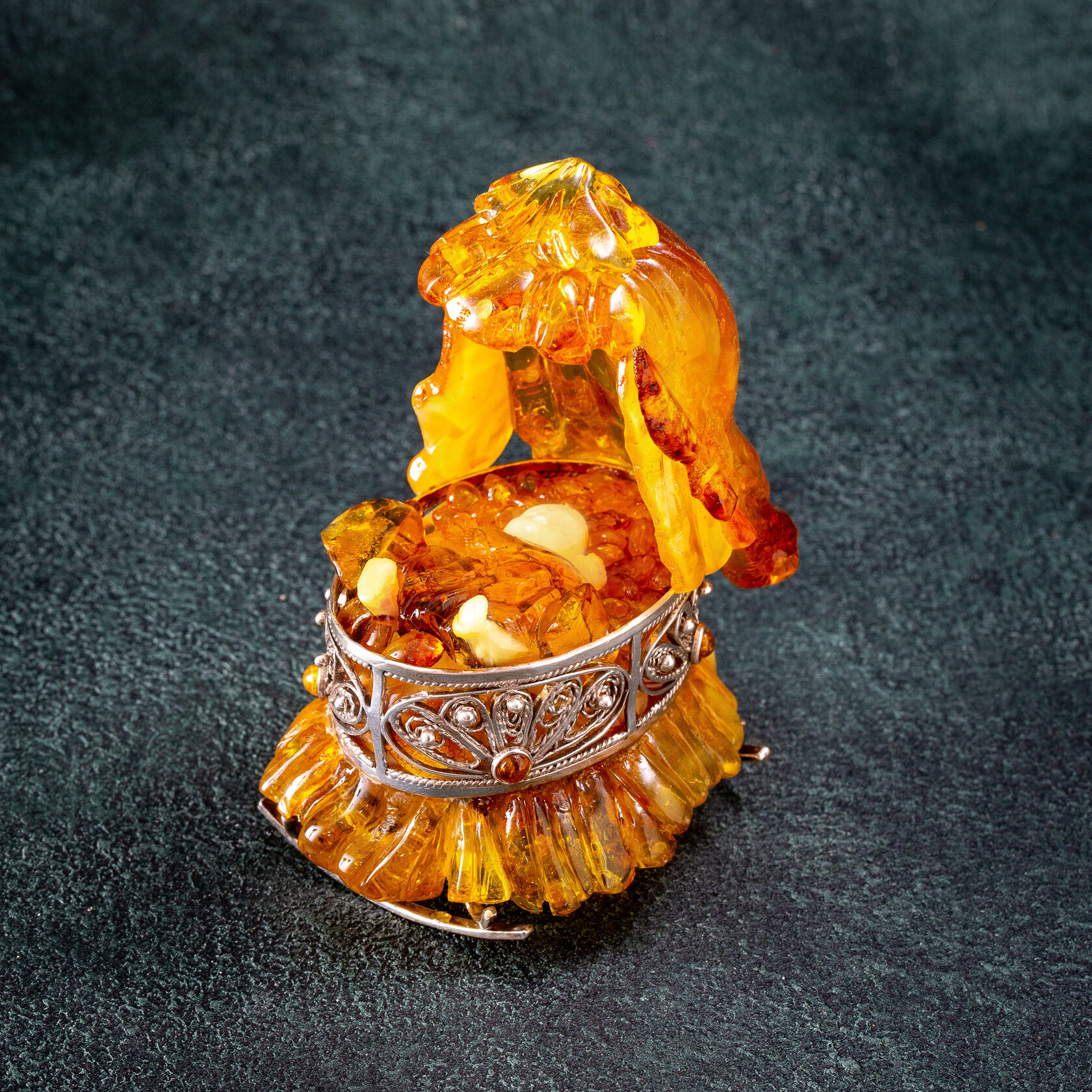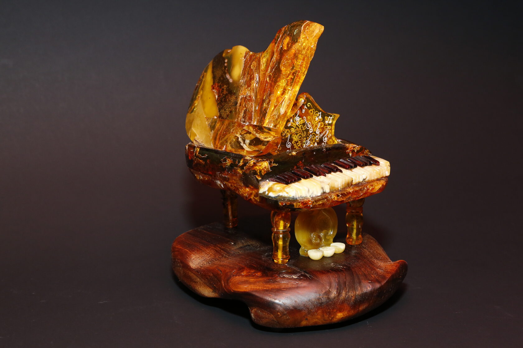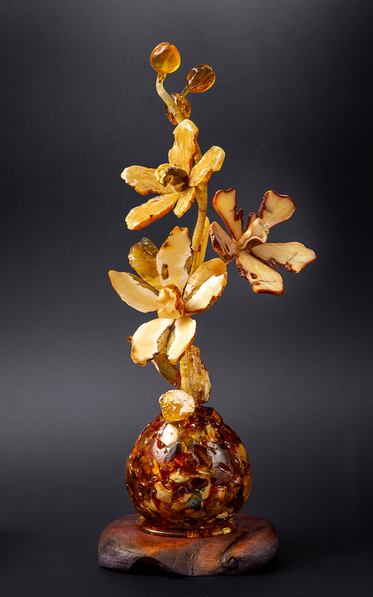 Янтарь, дерево, металл являются основными материалами автора, а любимыми техниками – резьба и мозаика.